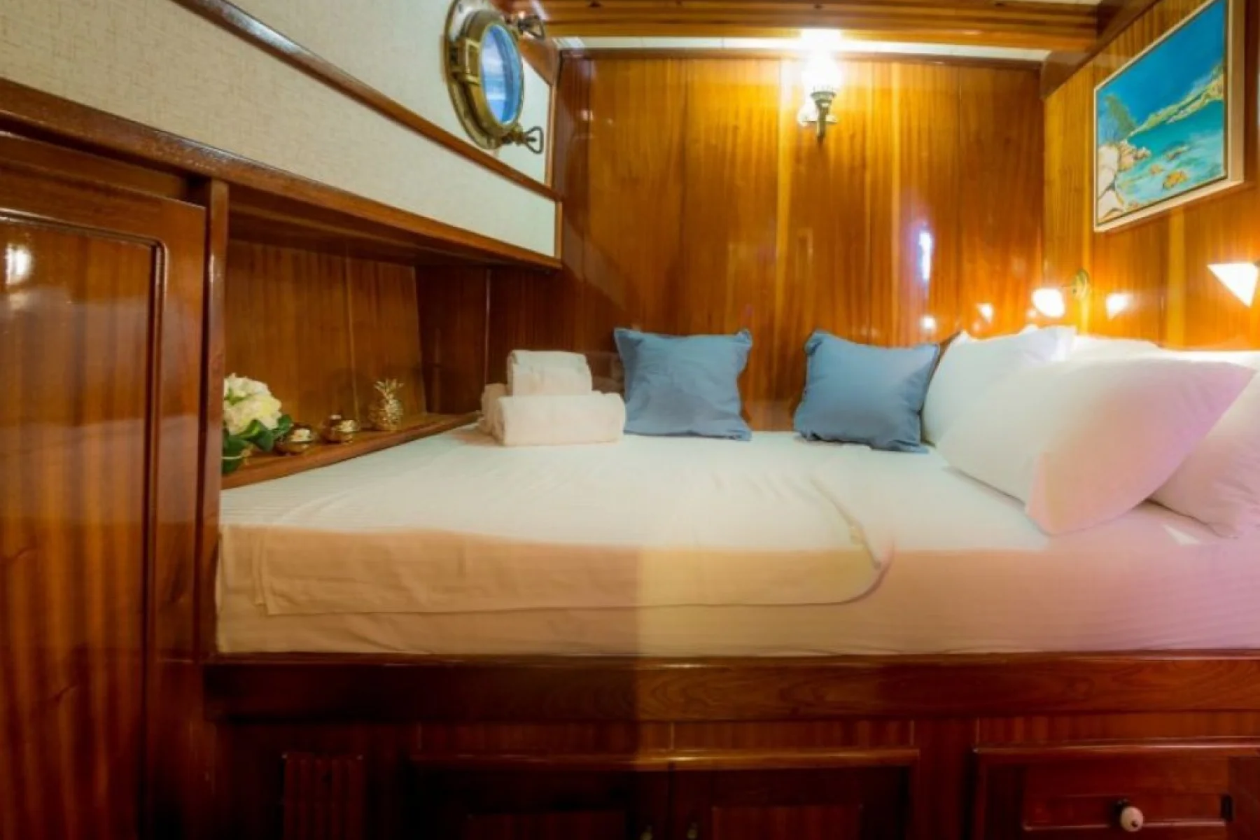 Yatımızın bütün kabinlerinde wc, duşa kabin, elbise dolabı, saç kurutma makinesi bulunmaktadır.