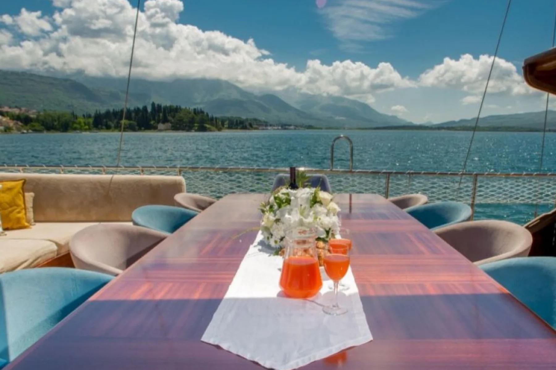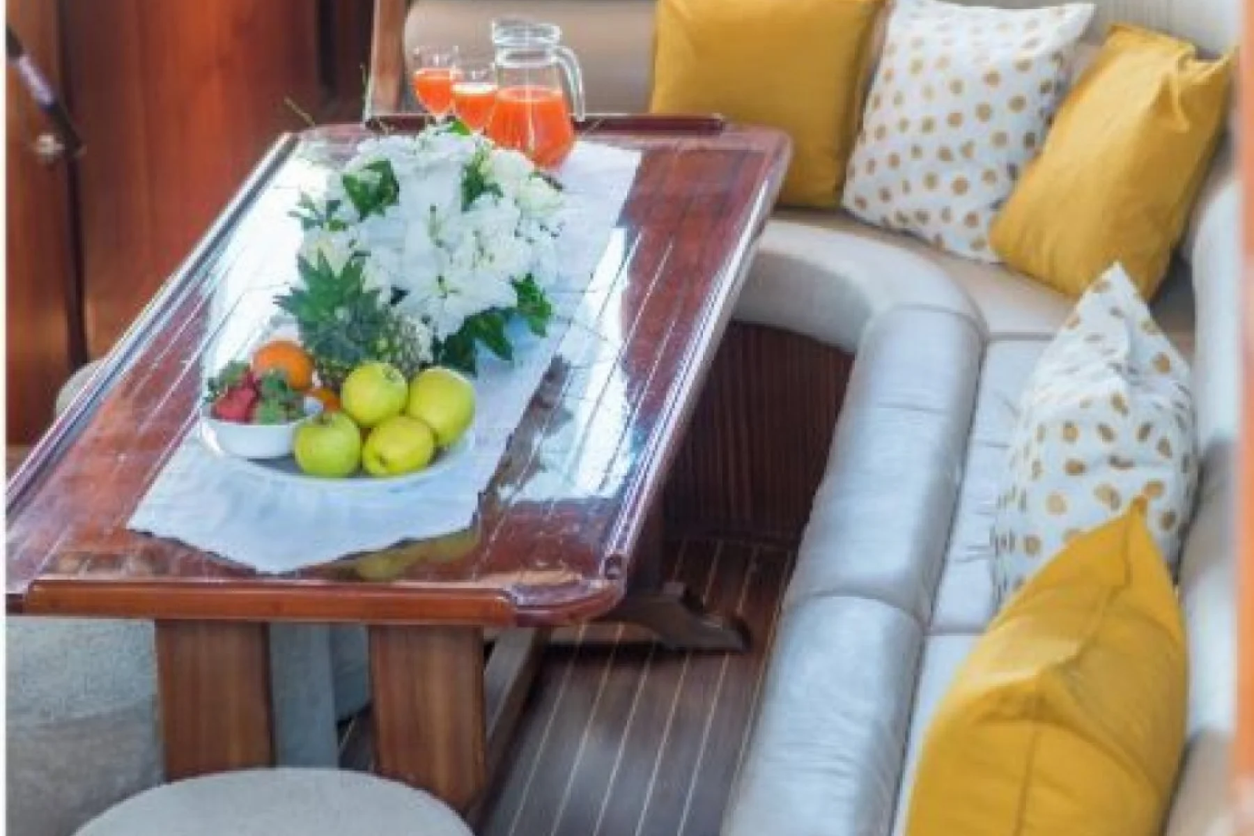 Tüm misafirlerimiz için ayrı ayrı güneşlenme minderleri, önde ve arkada özel minderli dinlenme alanları, sandalye, masa, servis takımları, güvenlik ekipmanları, gözlük ve palet mevcuttur.