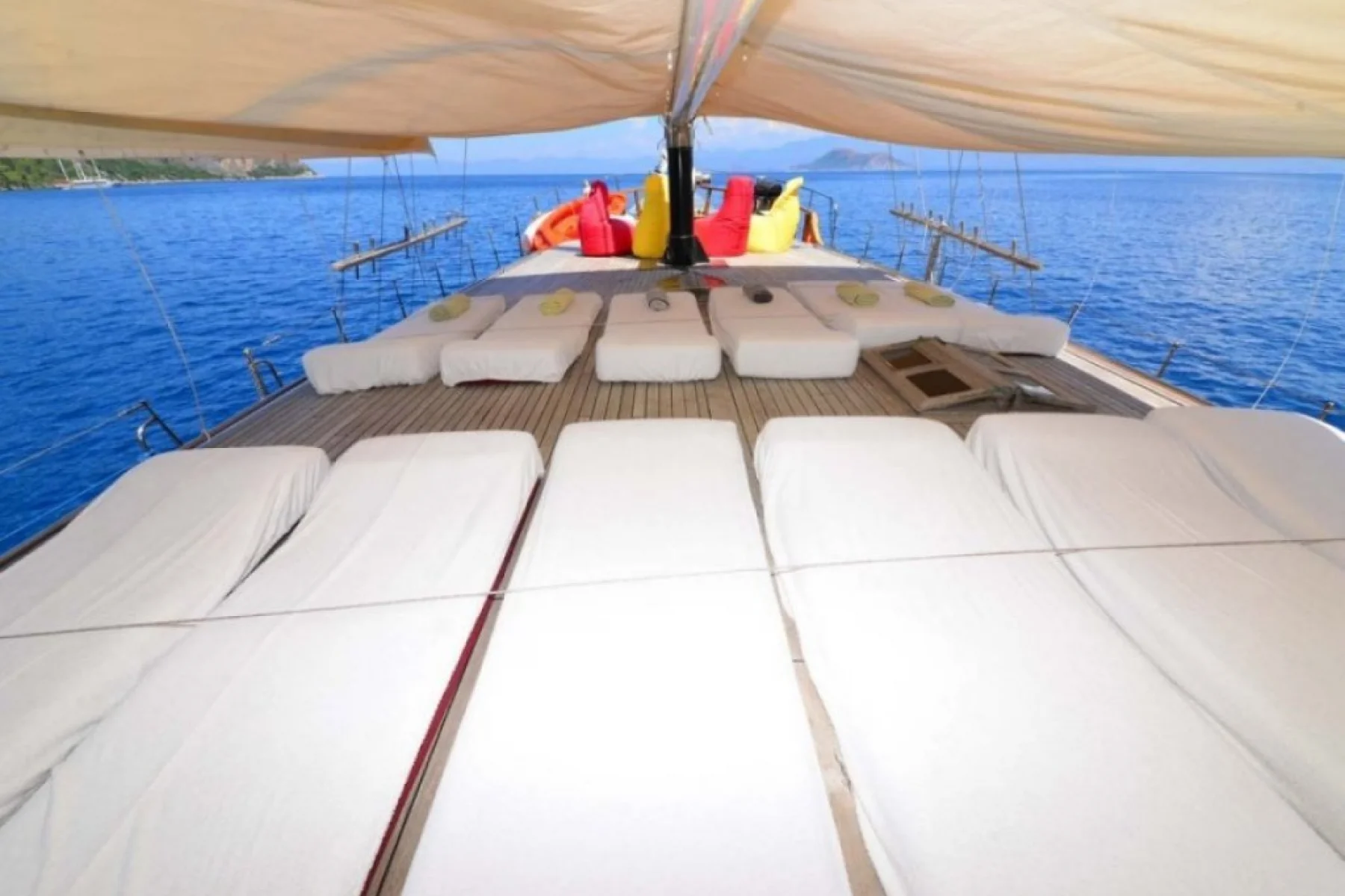 Tüm misafirlerimiz için ayrı ayrı güneşlenme minderleri, önde ve arkada özel minderli dinlenme alanları, sandalye, masa, servis takımları, güvenlik ekipmanları, gözlük ve palet mevcuttur.