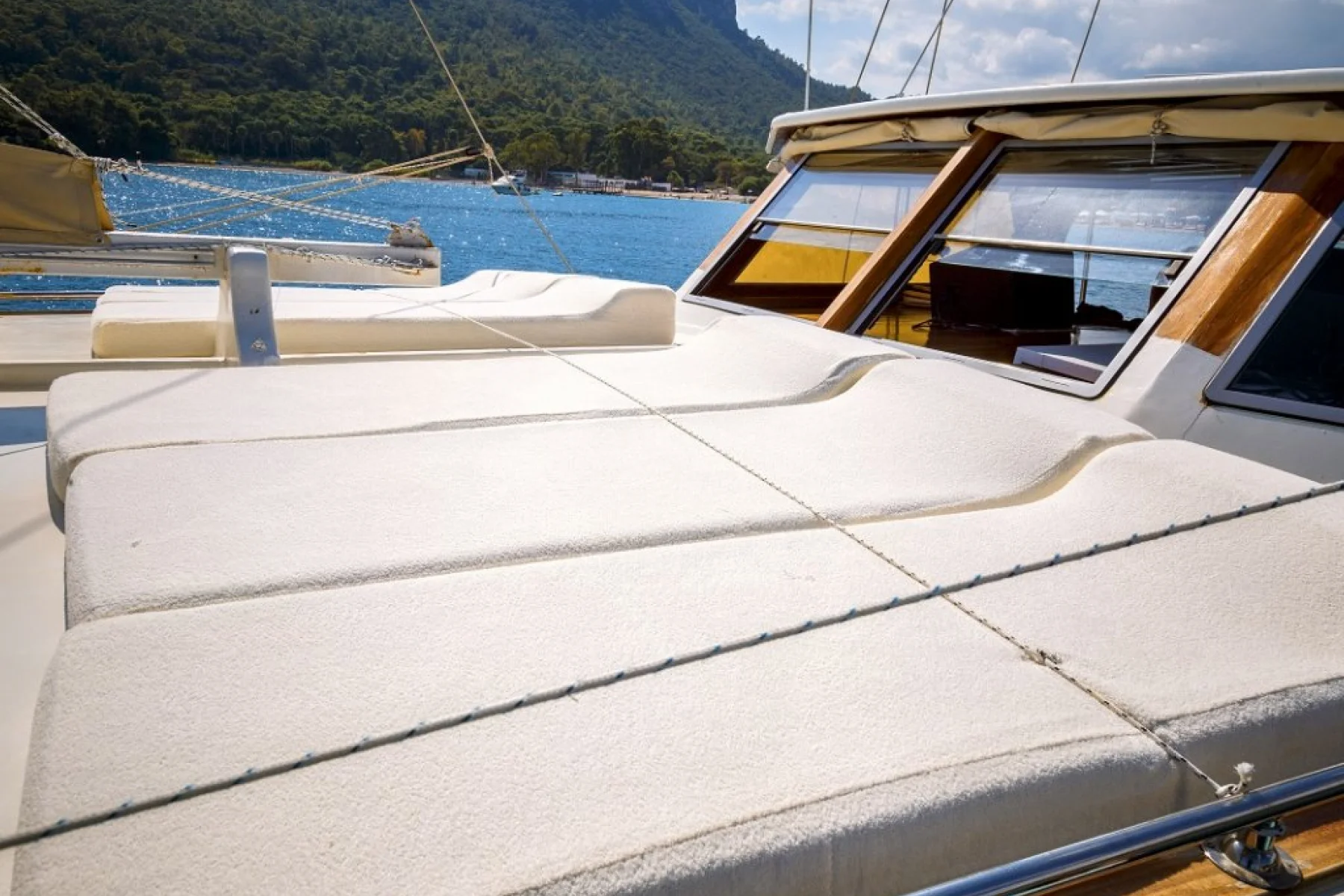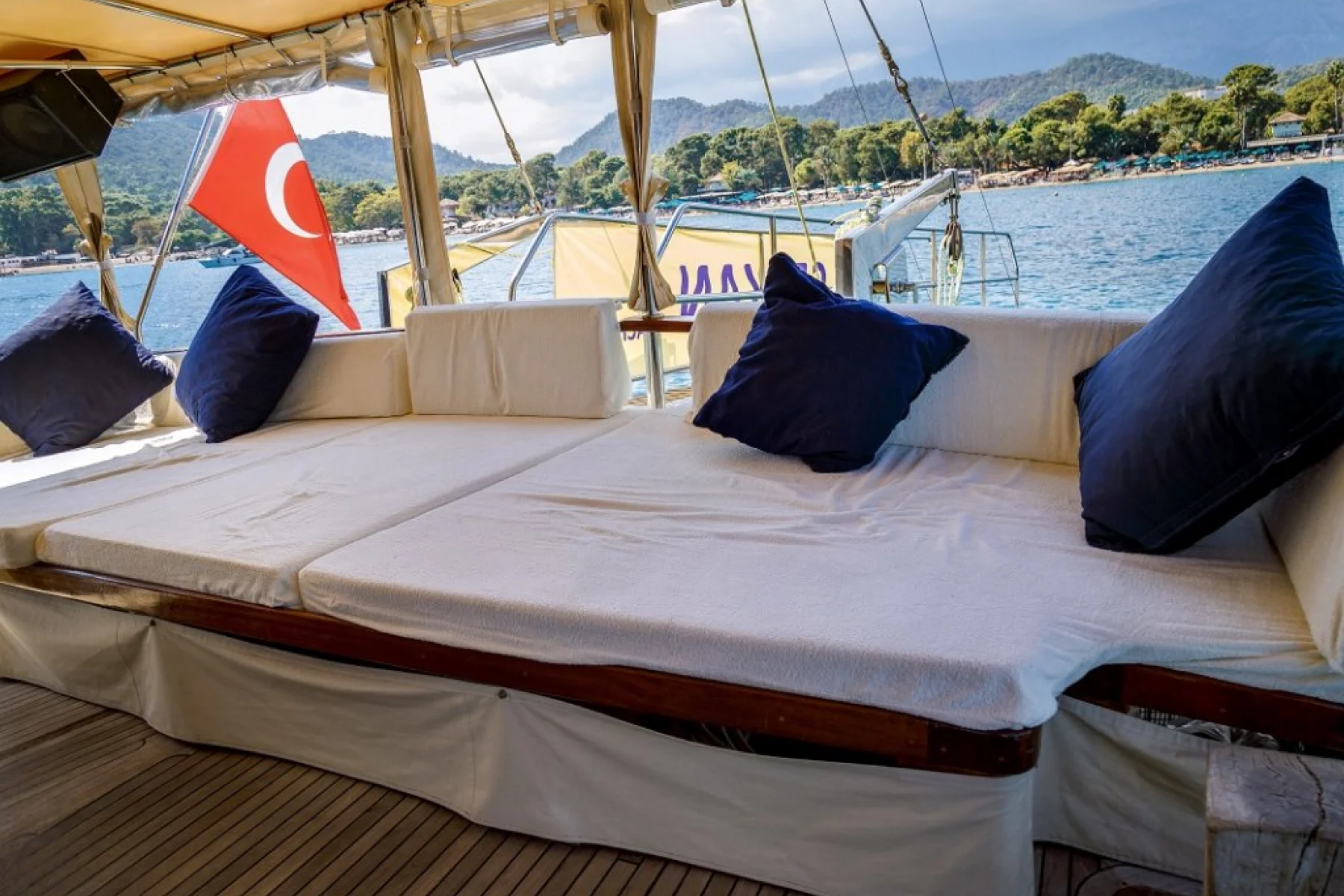 Tüm misafirlerimiz için ayrı ayrı güneşlenme minderleri, önde ve arkada özel minderli dinlenme alanları, sandalye, masa, servis takımları, güvenlik ekipmanları, gözlük ve palet mevcuttur.