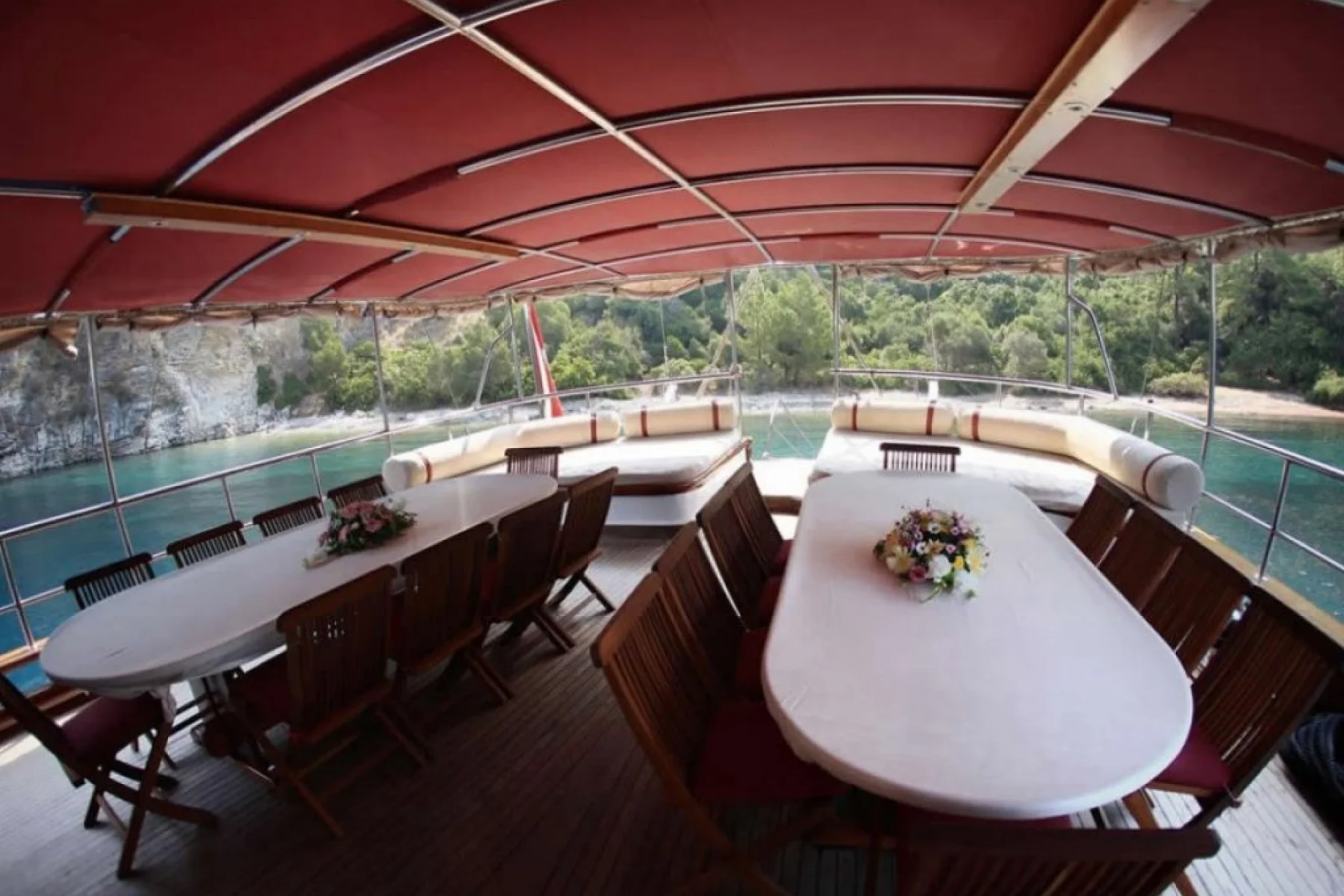 Tüm misafirlerimiz için ayrı ayrı güneşlenme minderleri, önde ve arkada özel minderli dinlenme alanları, sandalye, masa, servis takımları, güvenlik ekipmanları, gözlük ve palet mevcuttur.