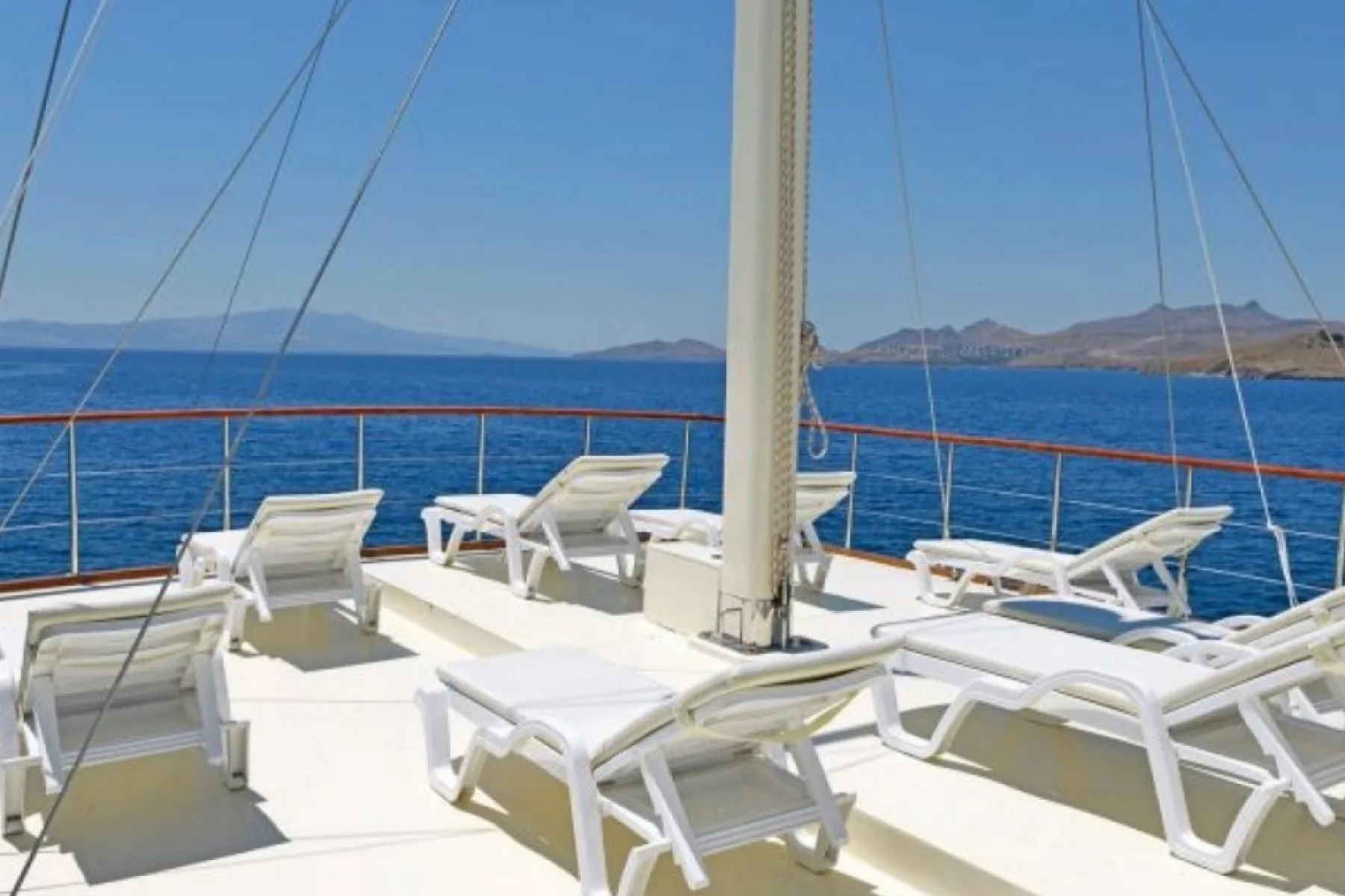 Tüm misafirlerimiz için ayrı ayrı güneşlenme minderleri, önde ve arkada özel minderli dinlenme alanları, sandalye, masa, servis takımları, güvenlik ekipmanları, gözlük ve palet mevcuttur.