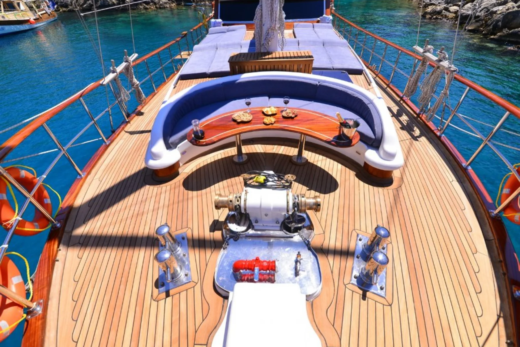 Tüm misafirlerimiz için ayrı ayrı güneşlenme minderleri, önde ve arkada özel minderli dinlenme alanları, sandalye, masa, servis takımları, güvenlik ekipmanları, gözlük ve palet mevcuttur.