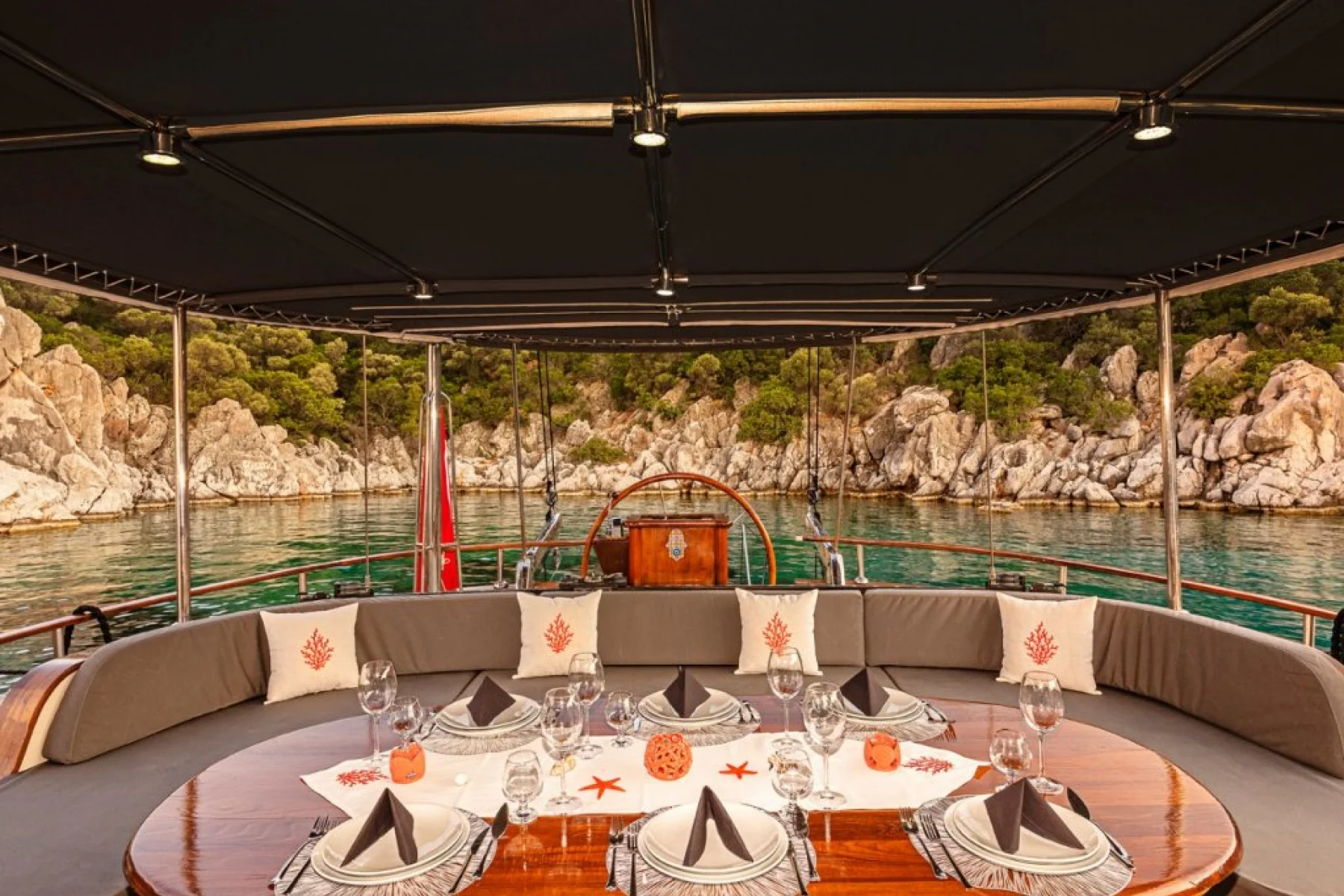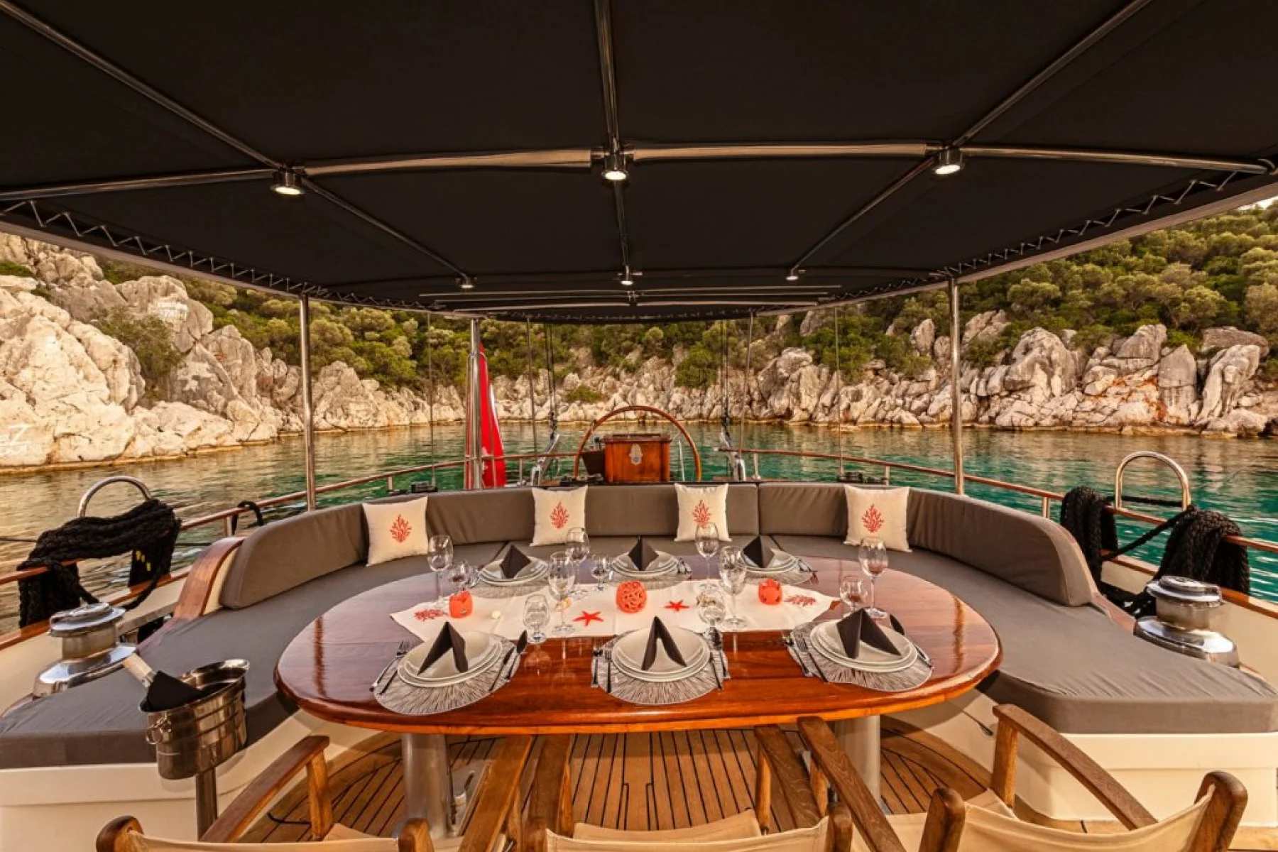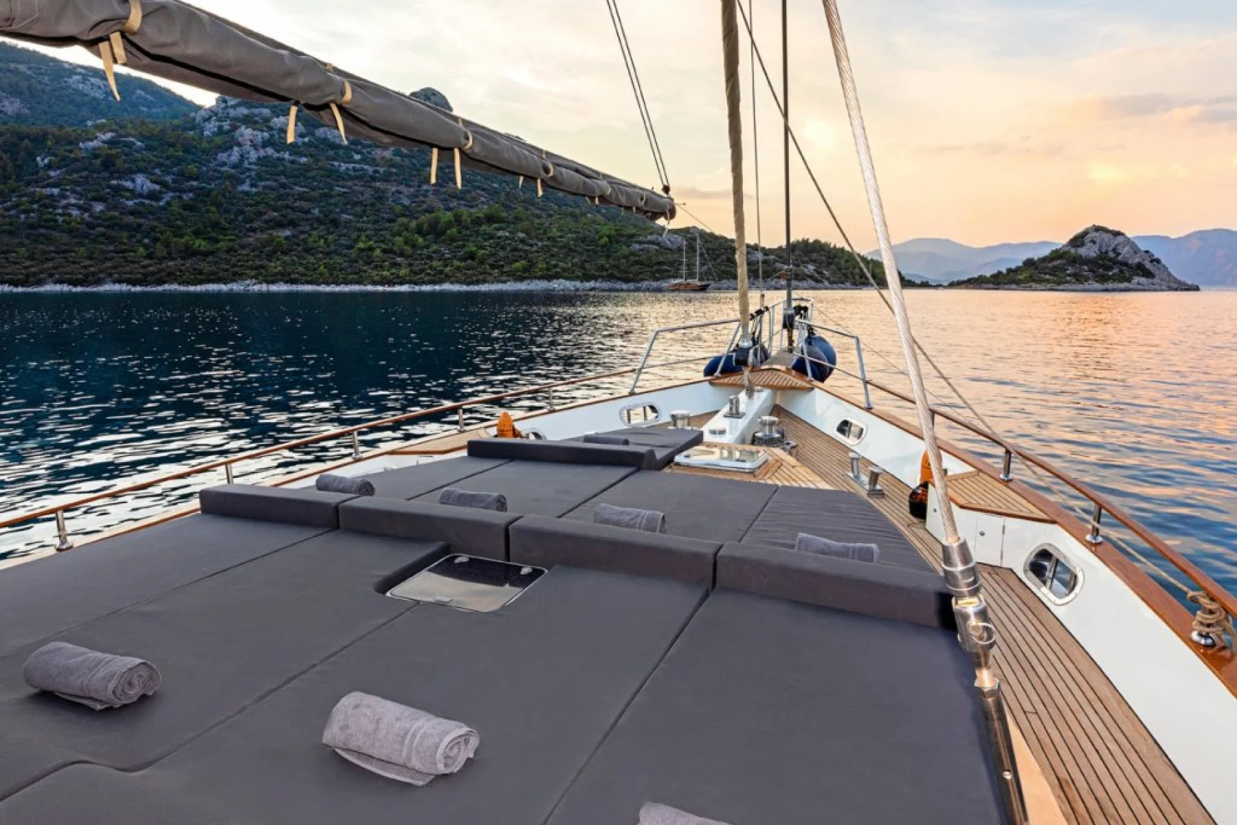 Tüm misafirlerimiz için ayrı ayrı güneşlenme minderleri, önde ve arkada özel minderli dinlenme alanları, sandalye, masa, servis takımları, güvenlik ekipmanları, gözlük ve palet mevcuttur.