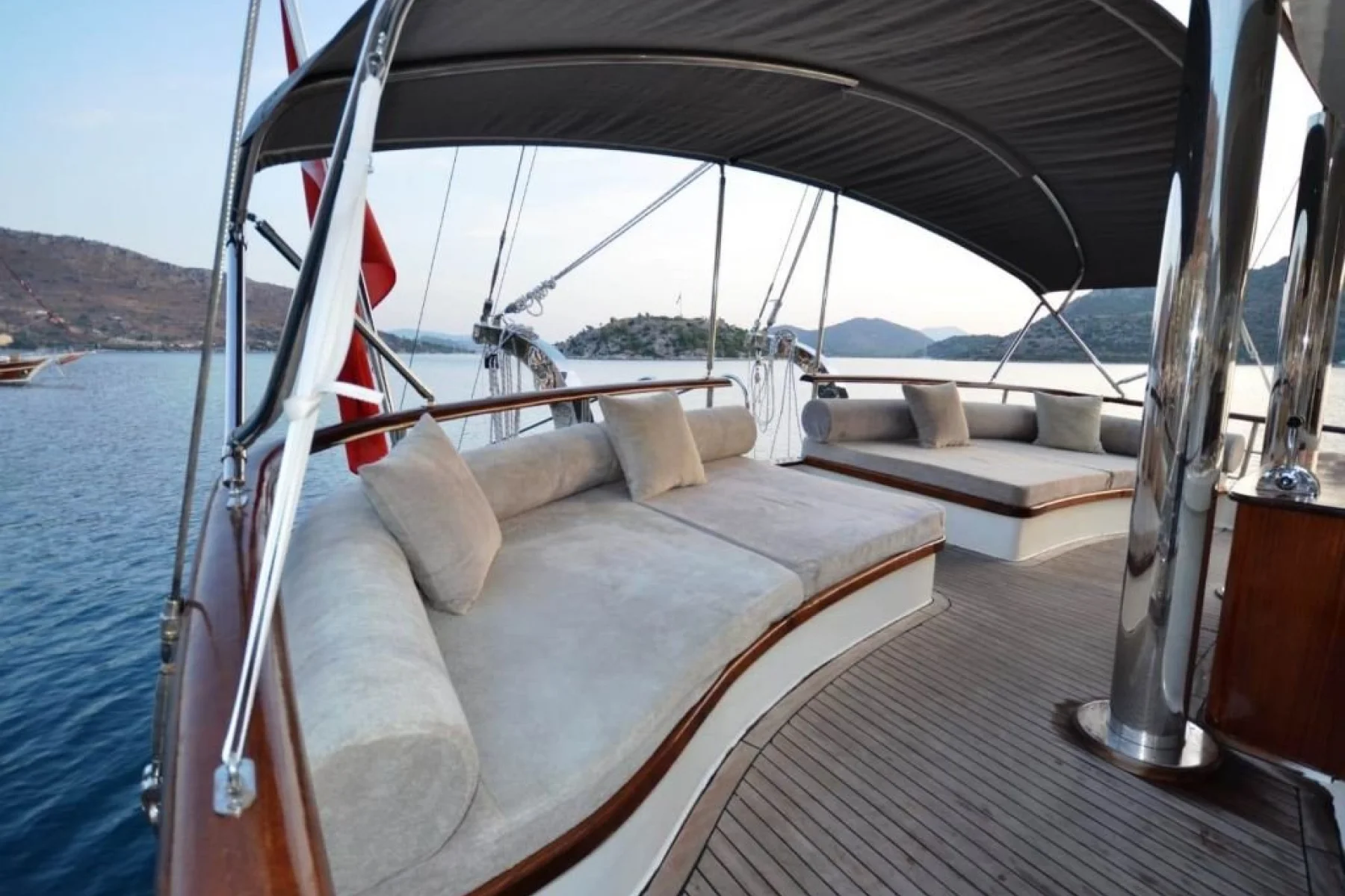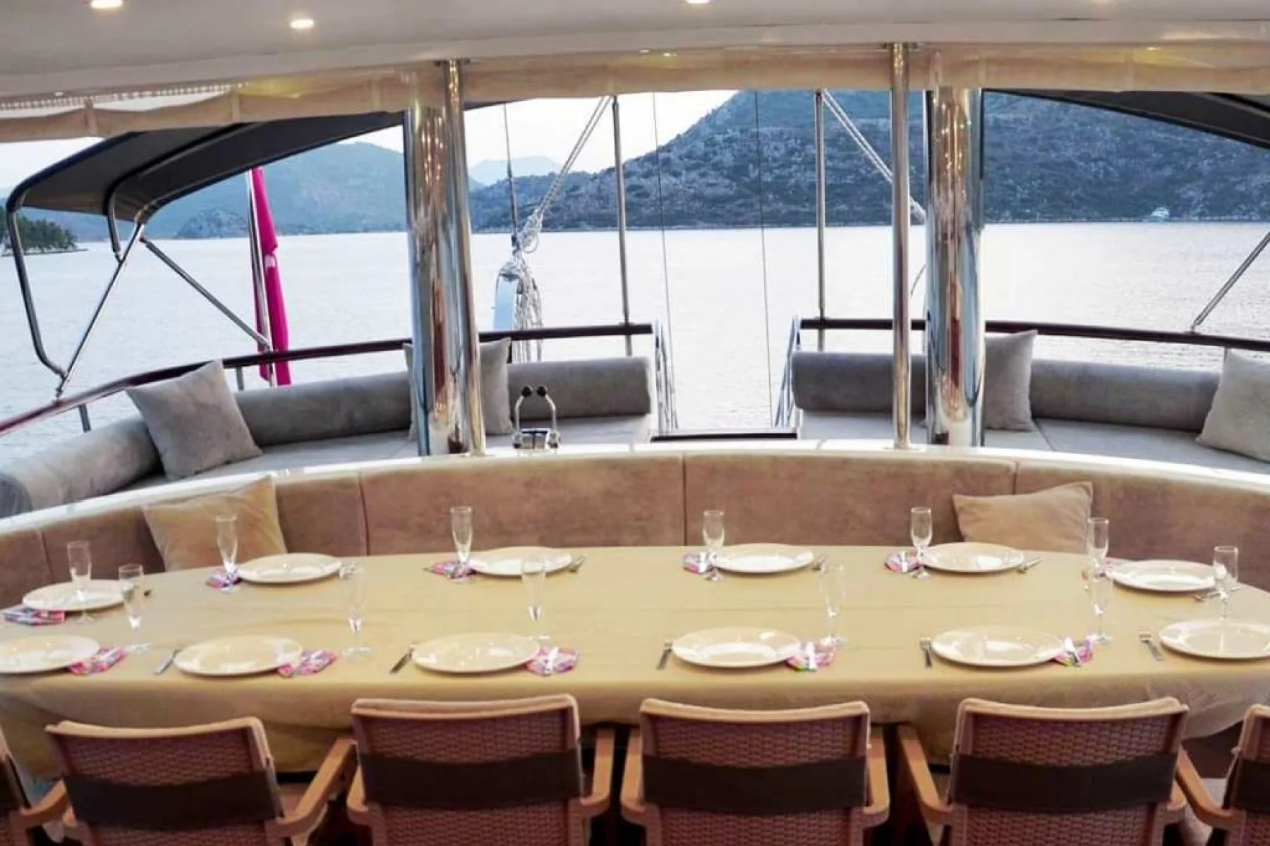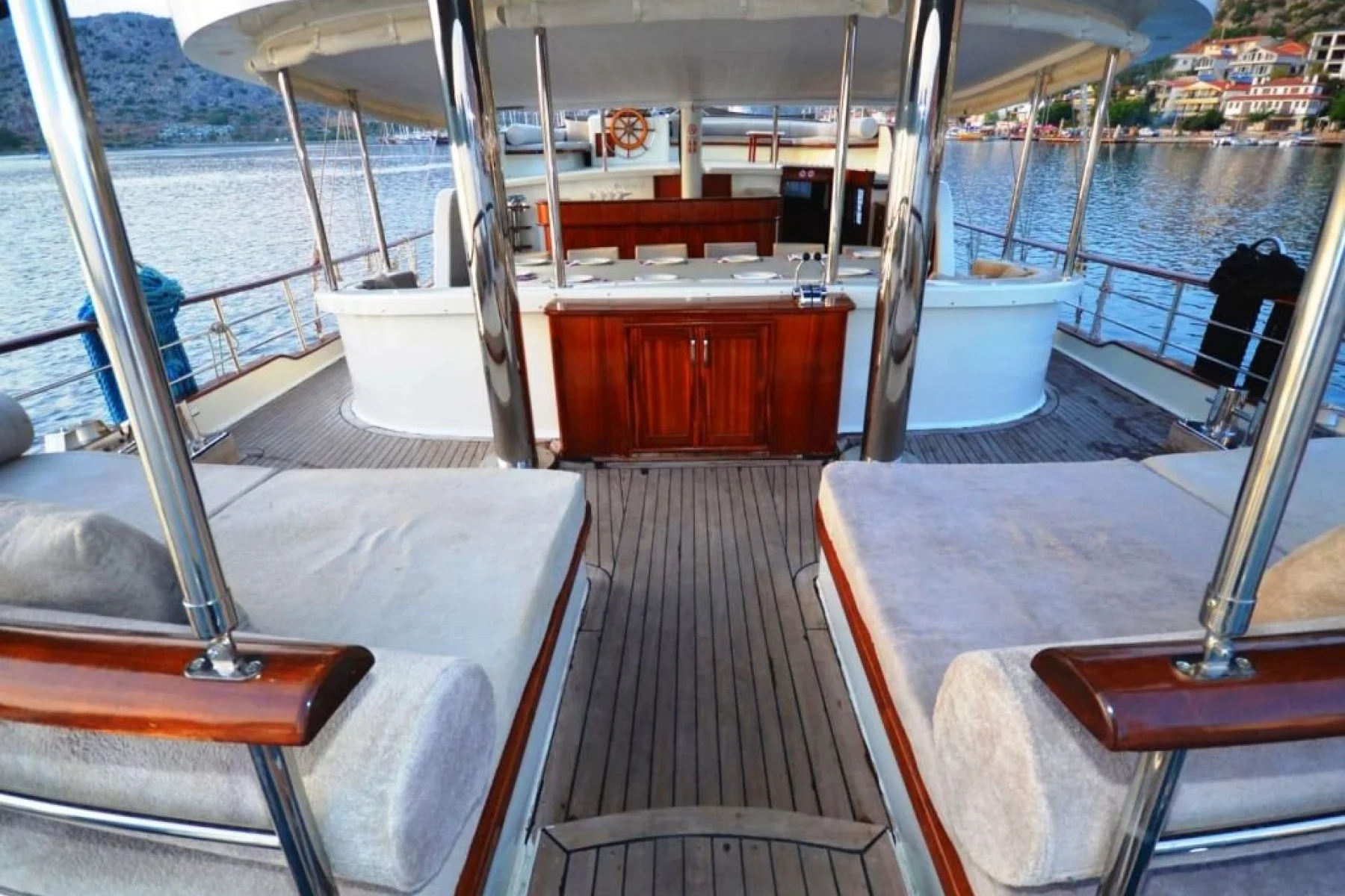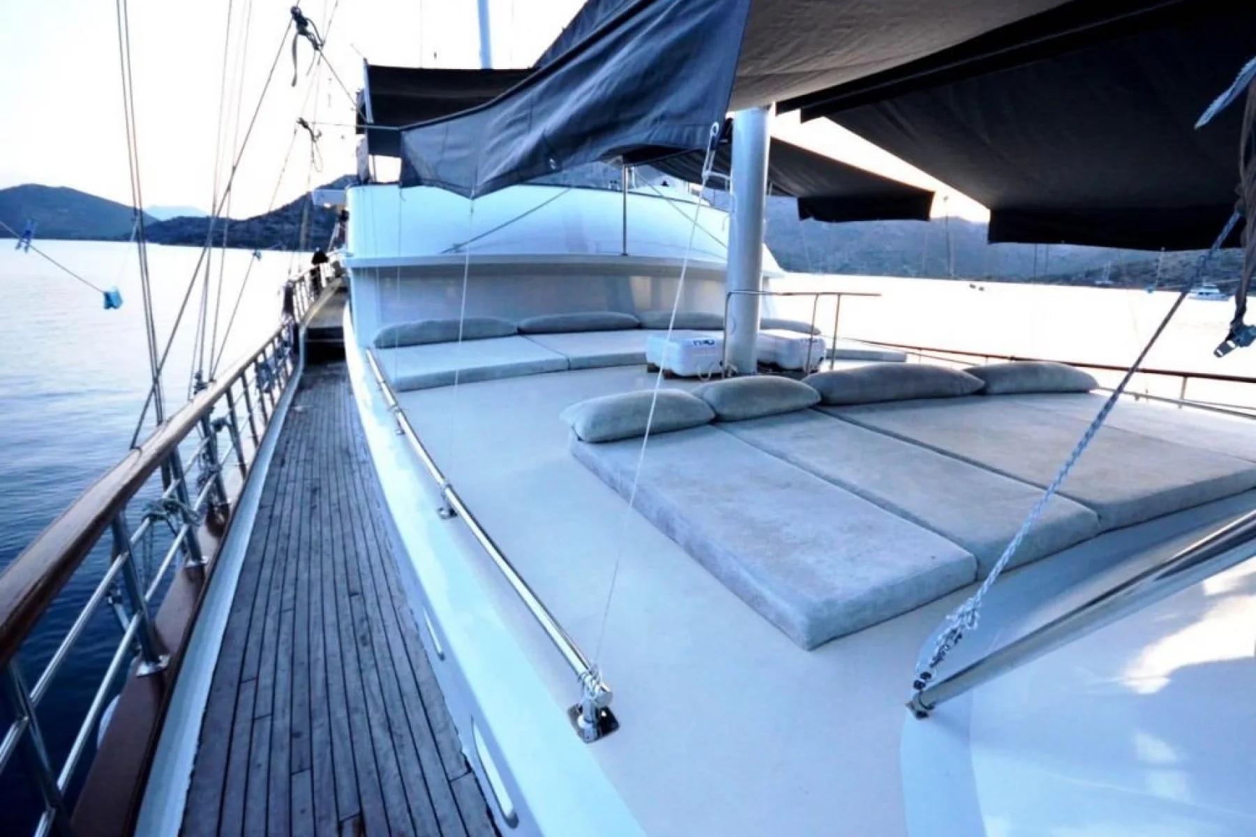 Tüm misafirlerimiz için ayrı ayrı güneşlenme minderleri, önde ve arkada özel minderli dinlenme alanları, sandalye, masa, servis takımları, güvenlik ekipmanları, gözlük ve palet mevcuttur.