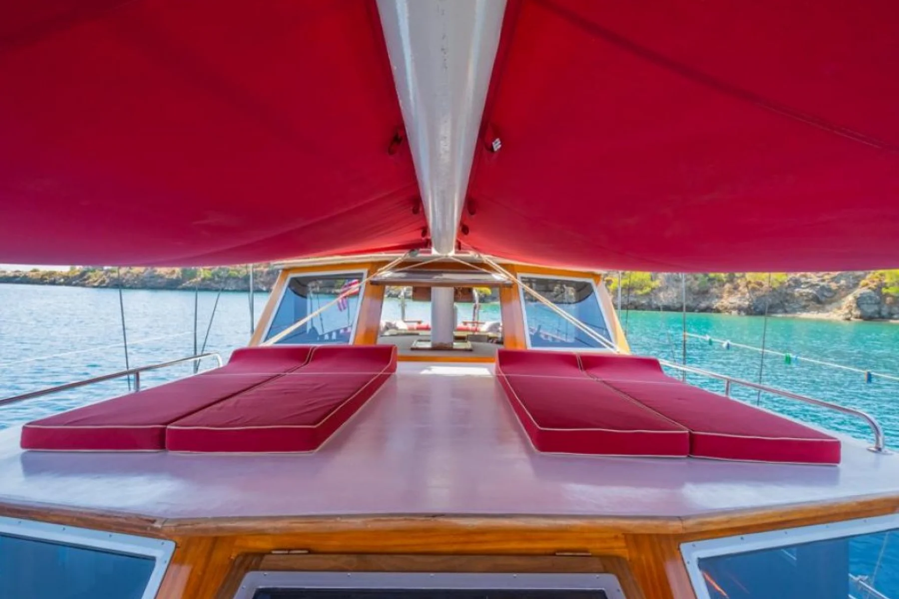 Tüm misafirlerimiz için ayrı ayrı güneşlenme minderleri, önde ve arkada özel minderli dinlenme alanları, sandalye, masa, servis takımları, güvenlik ekipmanları, gözlük ve palet mevcuttur.