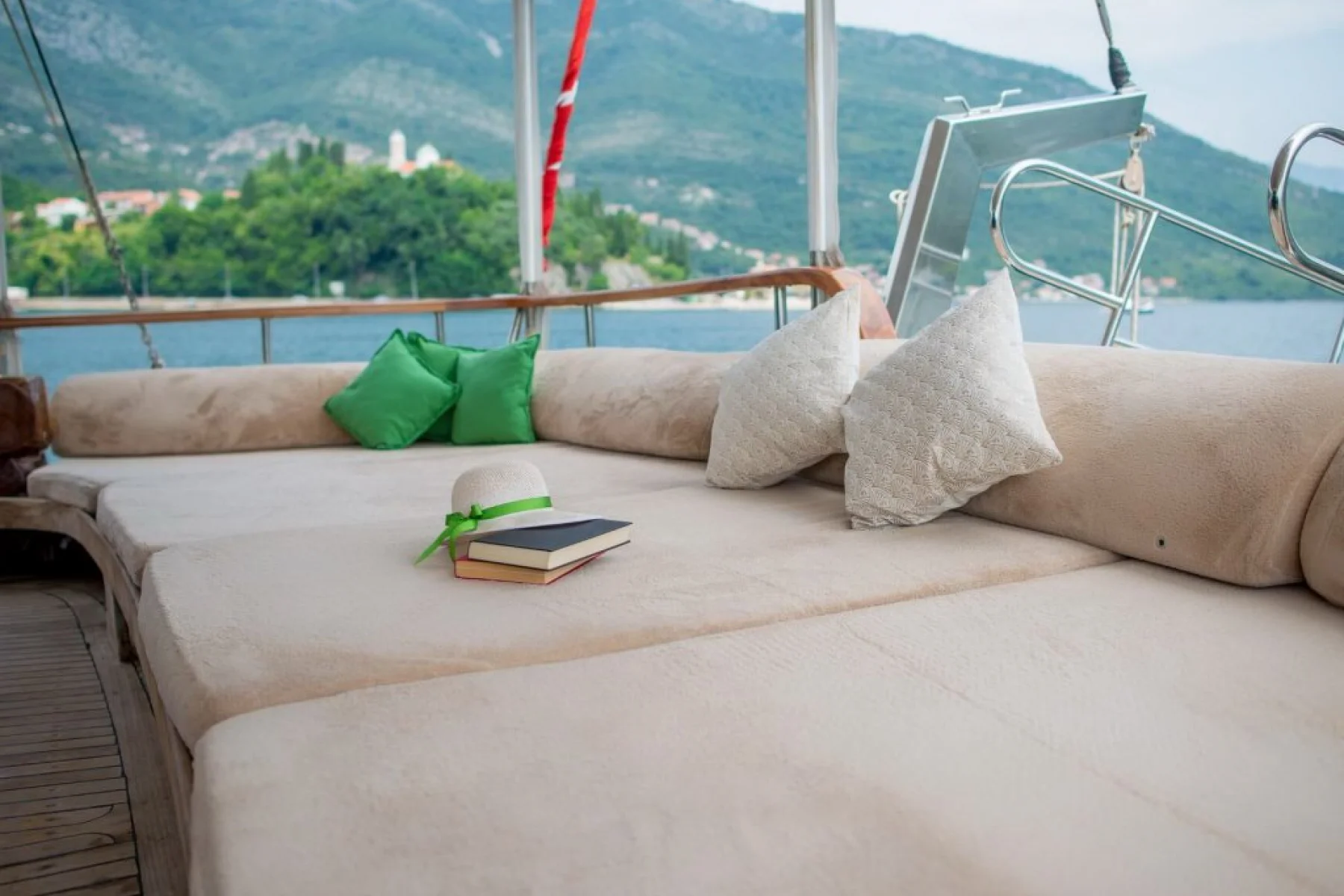Tüm misafirlerimiz için ayrı ayrı güneşlenme minderleri, önde ve arkada özel minderli dinlenme alanları, sandalye, masa, servis takımları, güvenlik ekipmanları, gözlük ve palet mevcuttur.