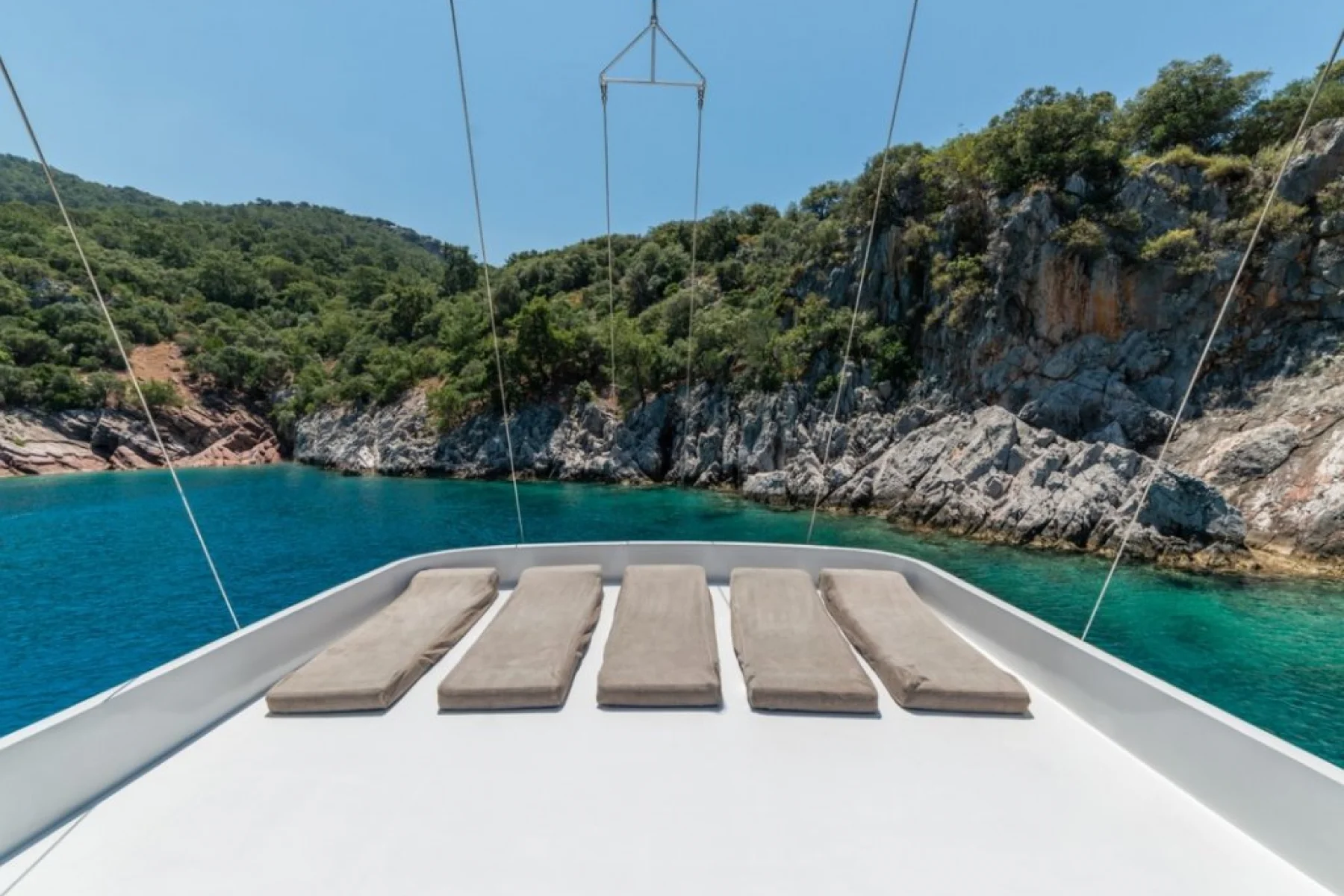 Tüm misafirlerimiz için ayrı ayrı güneşlenme minderleri, önde ve arkada özel minderli dinlenme alanları, sandalye, masa, servis takımları, güvenlik ekipmanları, gözlük ve palet mevcuttur.